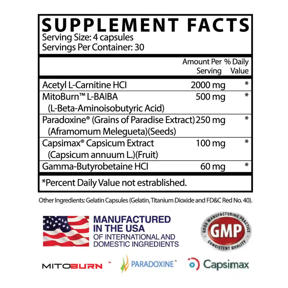 This innovative formula combines Acetyl-L-Carnitine HCL, MitoBurn, Paradoxine, Capsimax, and Gamma-Butyrobetaine HCL to supercharge your metabolism and support your fitness goals.