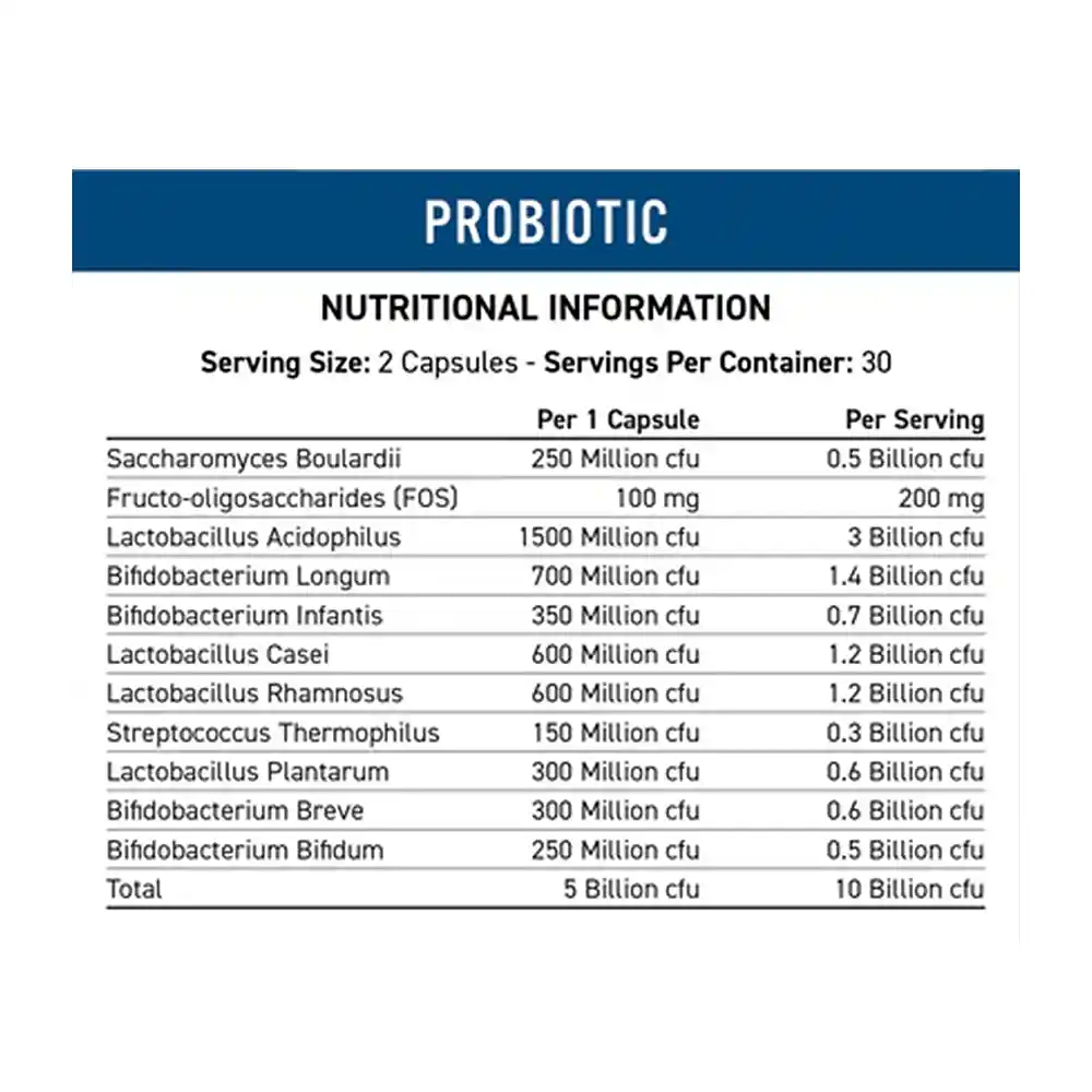 Applied Nutrition Probiotic Advanced Multi-Strain Formula combines beneficial bacterial strains with fructo-oligosaccharides for comprehensive gut health support.