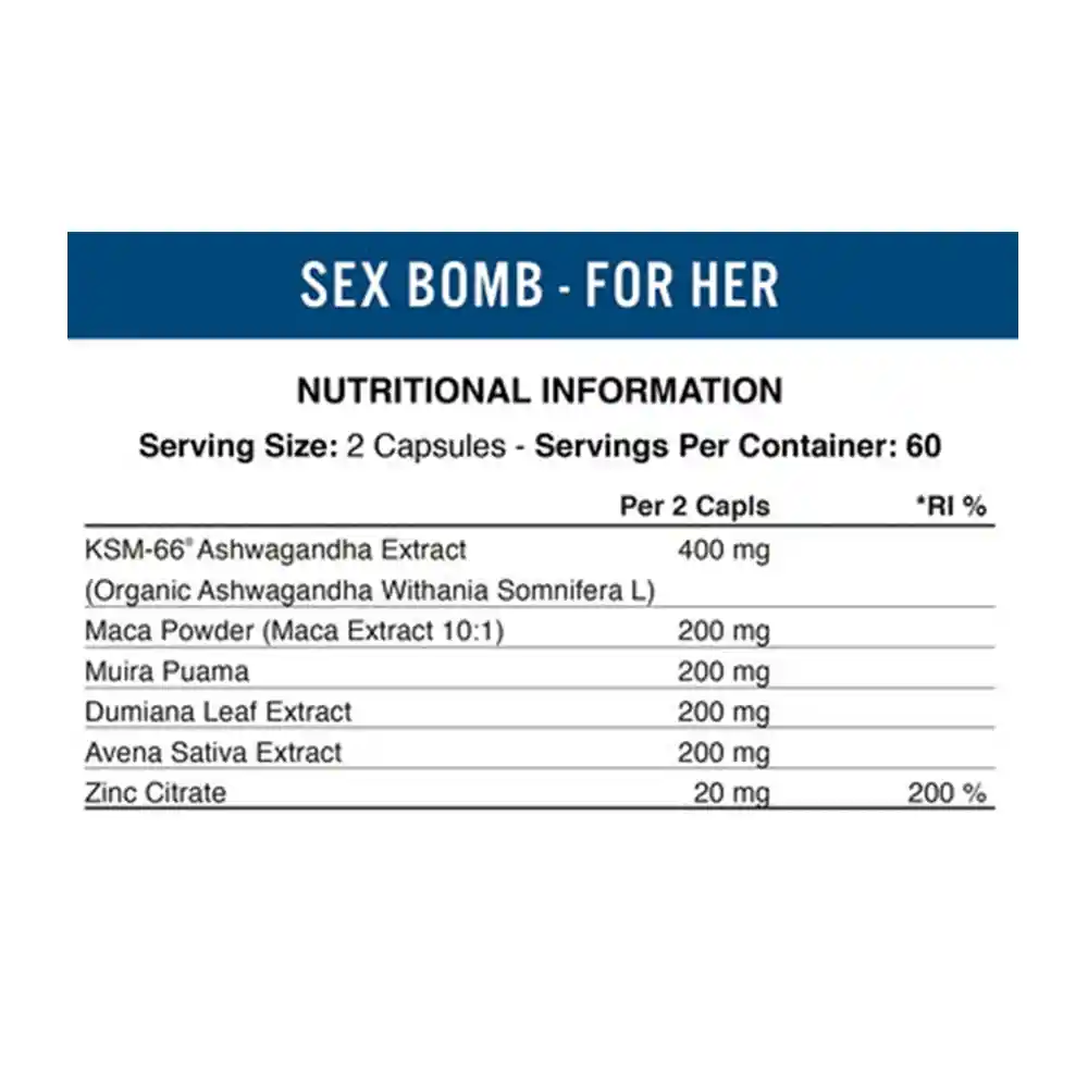 Applied Nutrition Sex Bomb for Her is a specially crafted blend featuring KSM-66 Ashwagandha, Maca, and more to support female vitality and desire.