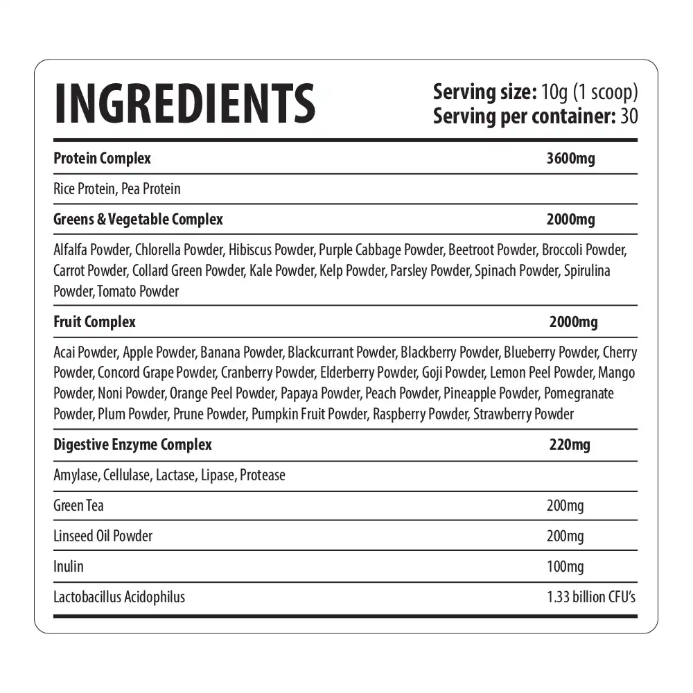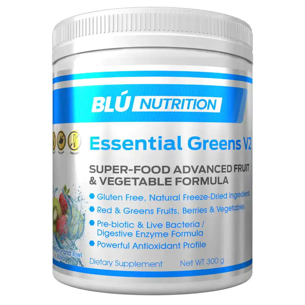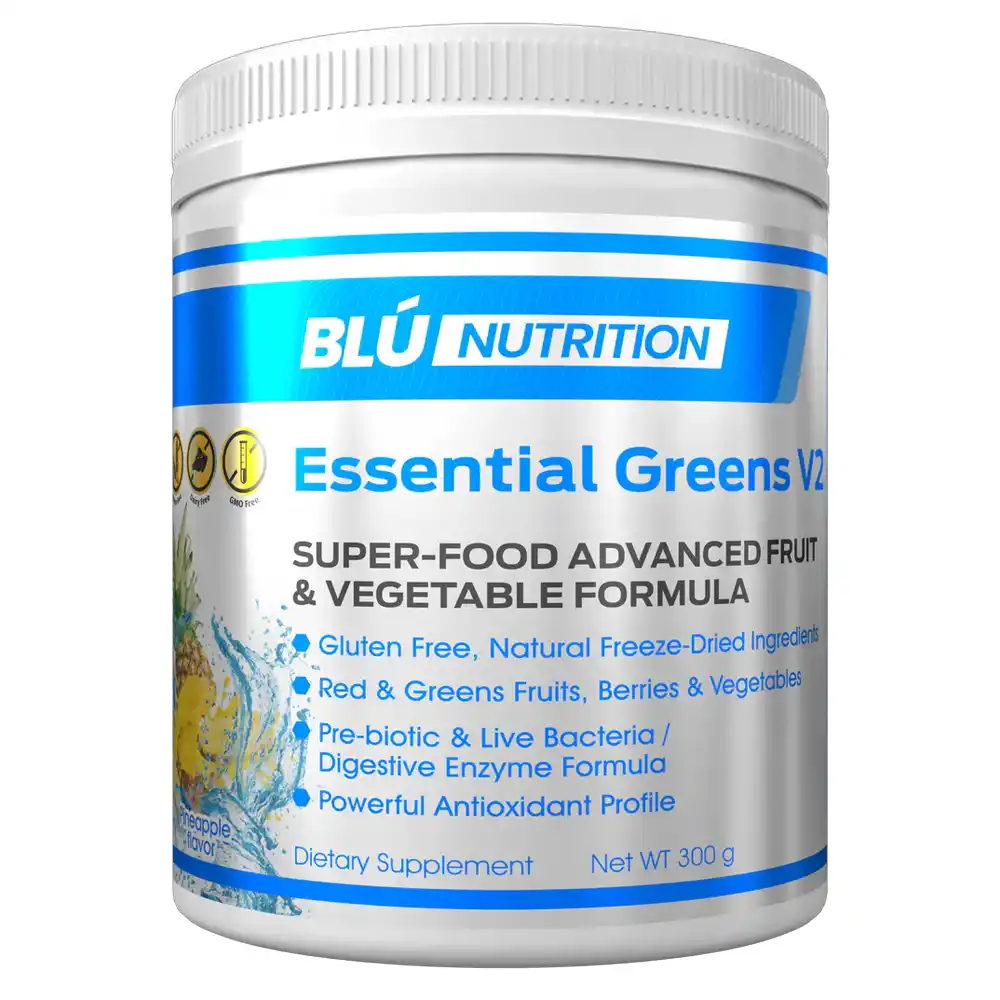 Blu Nutrition Essential Greens v2 Super-food combines 34 powerful superfood ingredients, including fruits, vegetables, proteins, and probiotics, to boost daily nutrition and overall wellness.