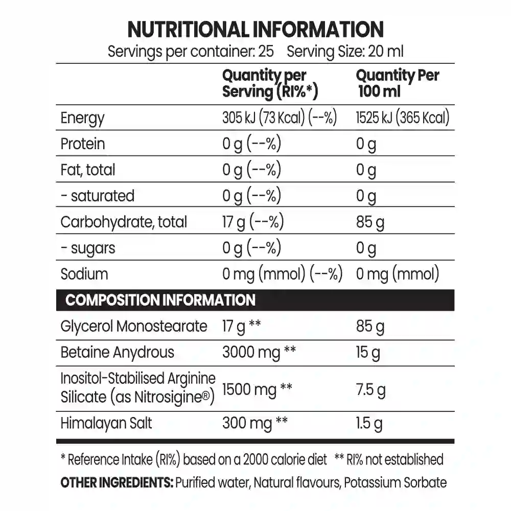 A liquid pump powerhouse, combining Glycerol Monostearate, Betaine, Nitrosigine, and Himalayan Salt for next-level workouts. Maximize your pump, endurance, and vascularity with this potent formula.