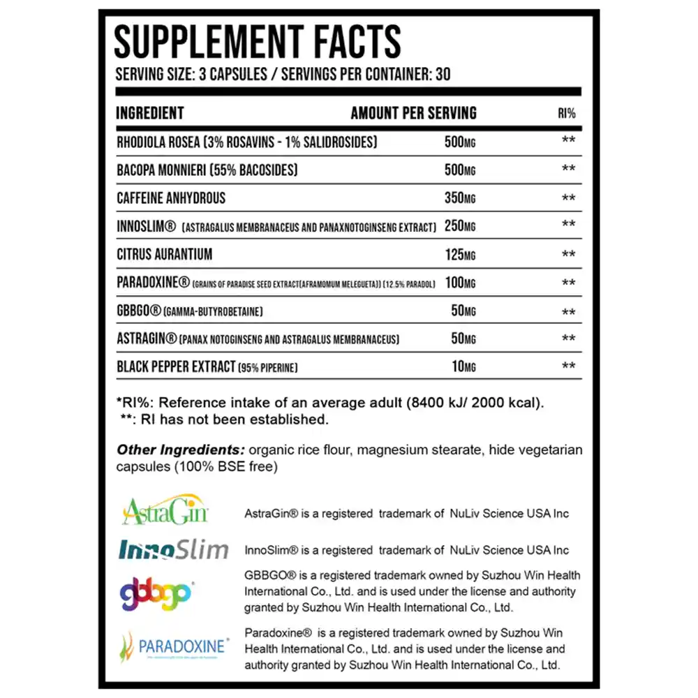A powerhouse pre-workout blend of Rhodiola Rosea, Bacopa Monnieri, caffeine, and more. Get ready to unleash your potential and conquer your workouts.