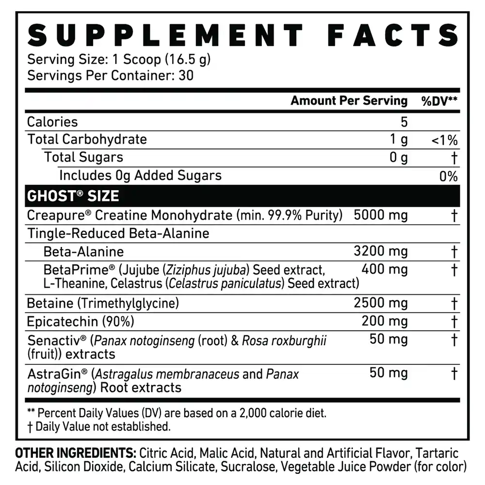 Ghost Size is a premium muscle-building formula featuring CreaPure Creatine Monohydrate, Beta Alanine, and Betaine for maximum gains.