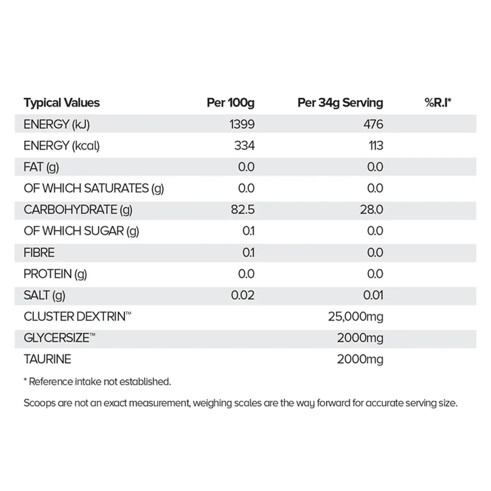 Featuring Cluster Dextrin, GlycerSize, and Taurine, this advanced formula provides sustained energy, optimal hydration, and enhanced endurance. Elevate your training and conquer every session with this performance-boosting carbohydrate supplement.